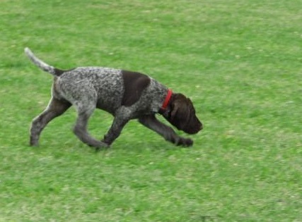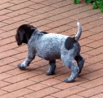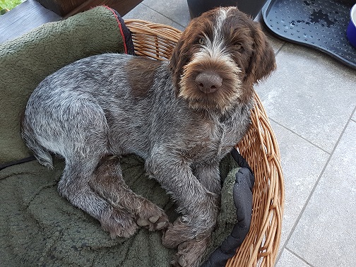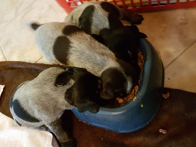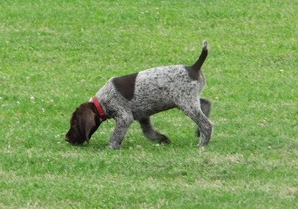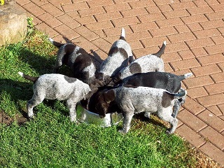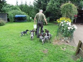 Von unseren 11 Welpen sind bereits 8 vergeben. 3 Braunschimmel-Rüden wären noch frei. Wir haben uns vorgenommen, 1 oder 2 Welpen selbst auszubilden. Jeden Abend werden 5 Minuten Ausbildung für jeden Welpen angesetzt, wobei sie einzeln an der Leine geführt werden und immer wieder mit ihrem Namen herangerufen werden. Als Belohnung gibt es ein Leckerli. Man merkt, dass sie auf Ihren Namen reagieren.