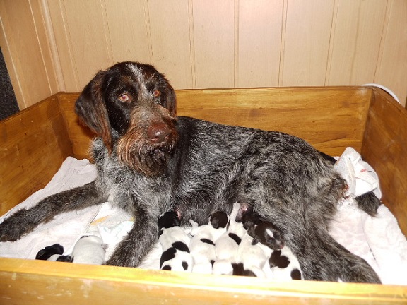 Raisa ist mit 2 Jahren recht jung und erfüllt ihre Mutterpflichten vorbildlich. Wir beobachten, dass sie, wenn sie zu ihren Welpen zurückkehrt, erst eine Runde dreht und ihre Welpen beschnüffelt. Erst dann legt sie sich hin. Sie entfernt sich nie sehr weit vom Zwinger und hat ihn immer im Auge. Unsere beiden erwachsenen DD wurden entschieden in die Schranken gewiesen, wobei sich Ella, unsere frühere Zuchthündin als sehr anhänglich erweist.