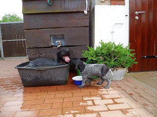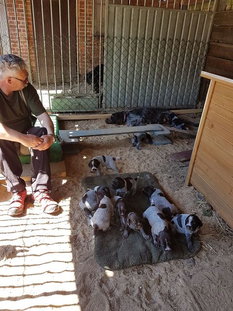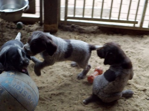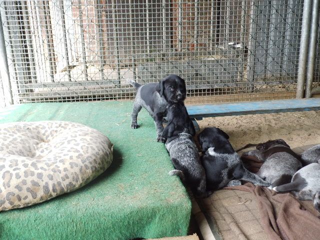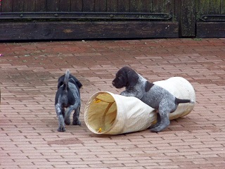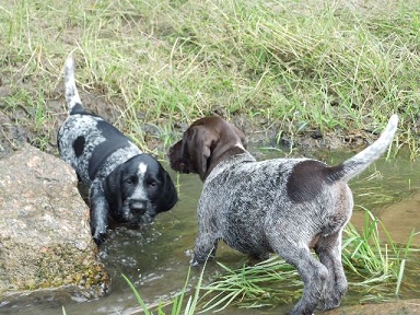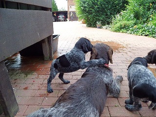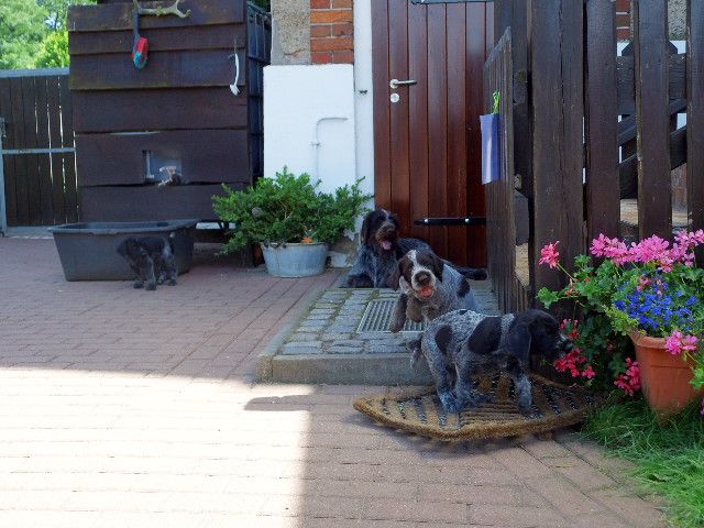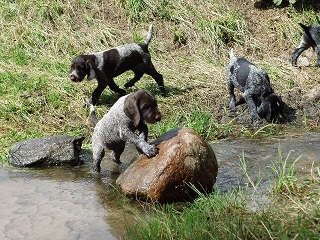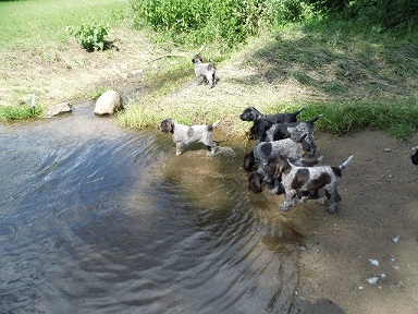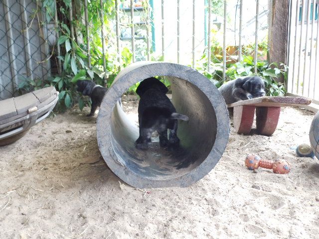 Anschliessend kommen sie in den Zwinger, wo sie sich von dem “anstrengenden Unterricht “ ausruhen. Die Welpen verstehen sich mit unseren großen Hunden sehr gut. Natürlich müssen sie auch mal zur Ordnung gerufen werden Wir machen jetzt Ausflüge ins Revier. Am Wasser sind unsere Welpen keineswegs ängstlich. Sie werden langsam an alles herangeführt.