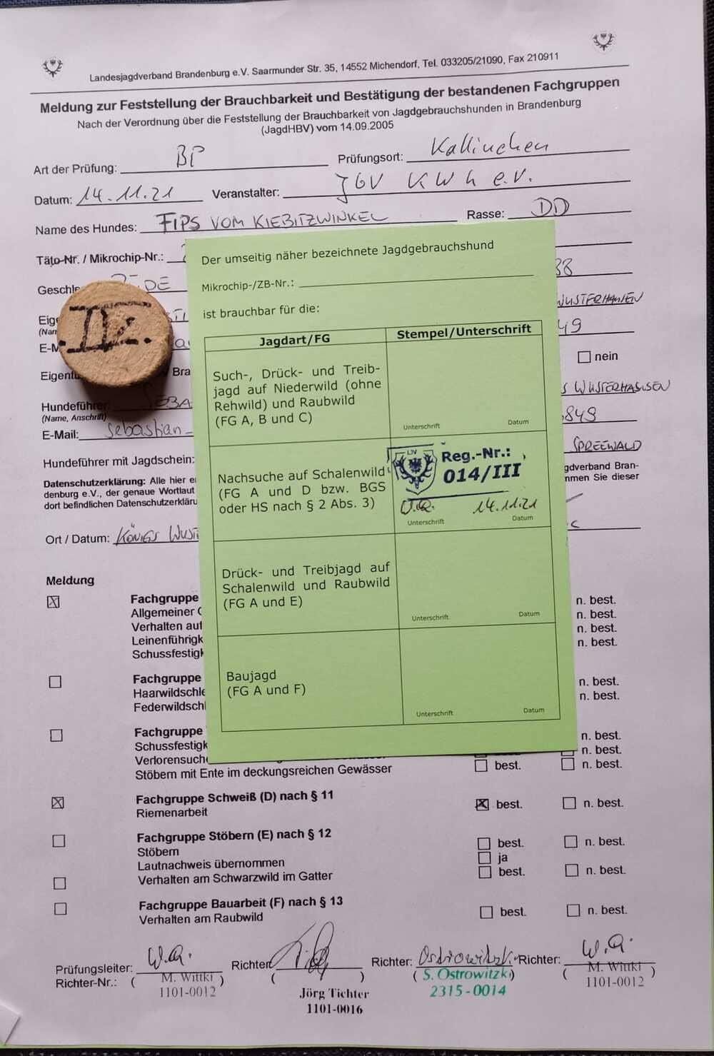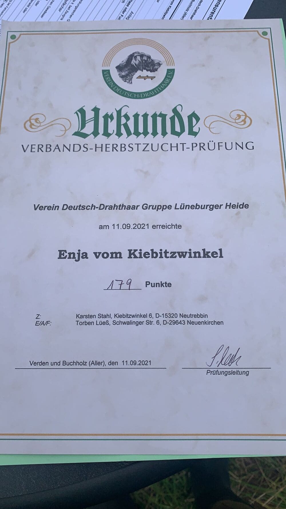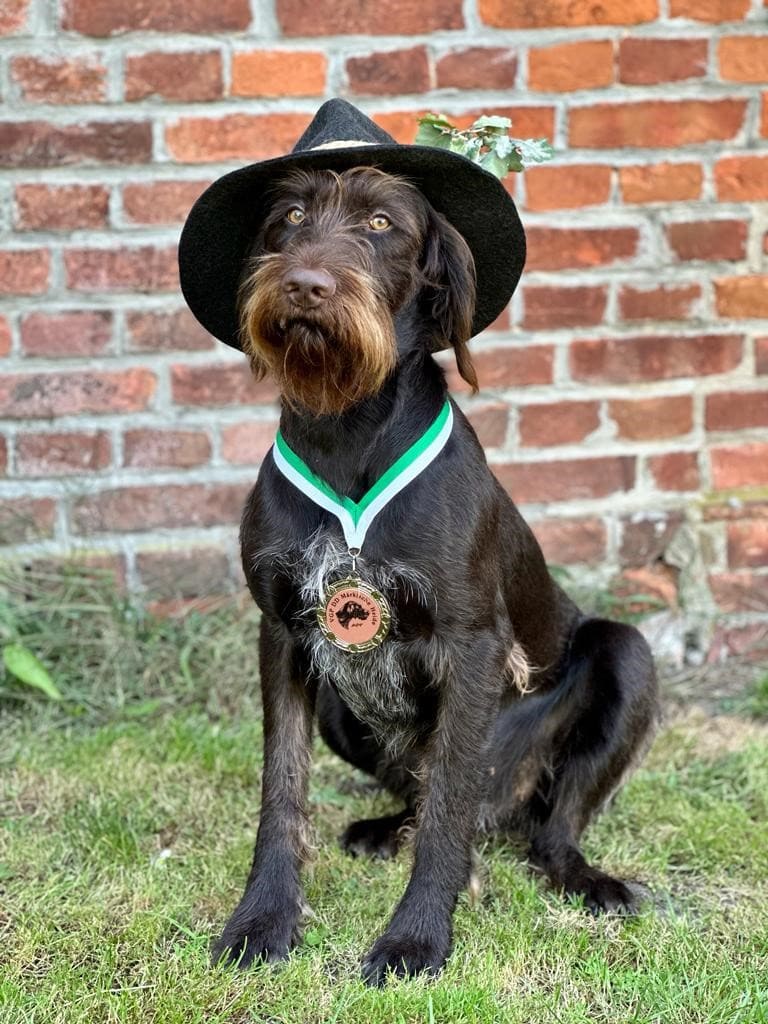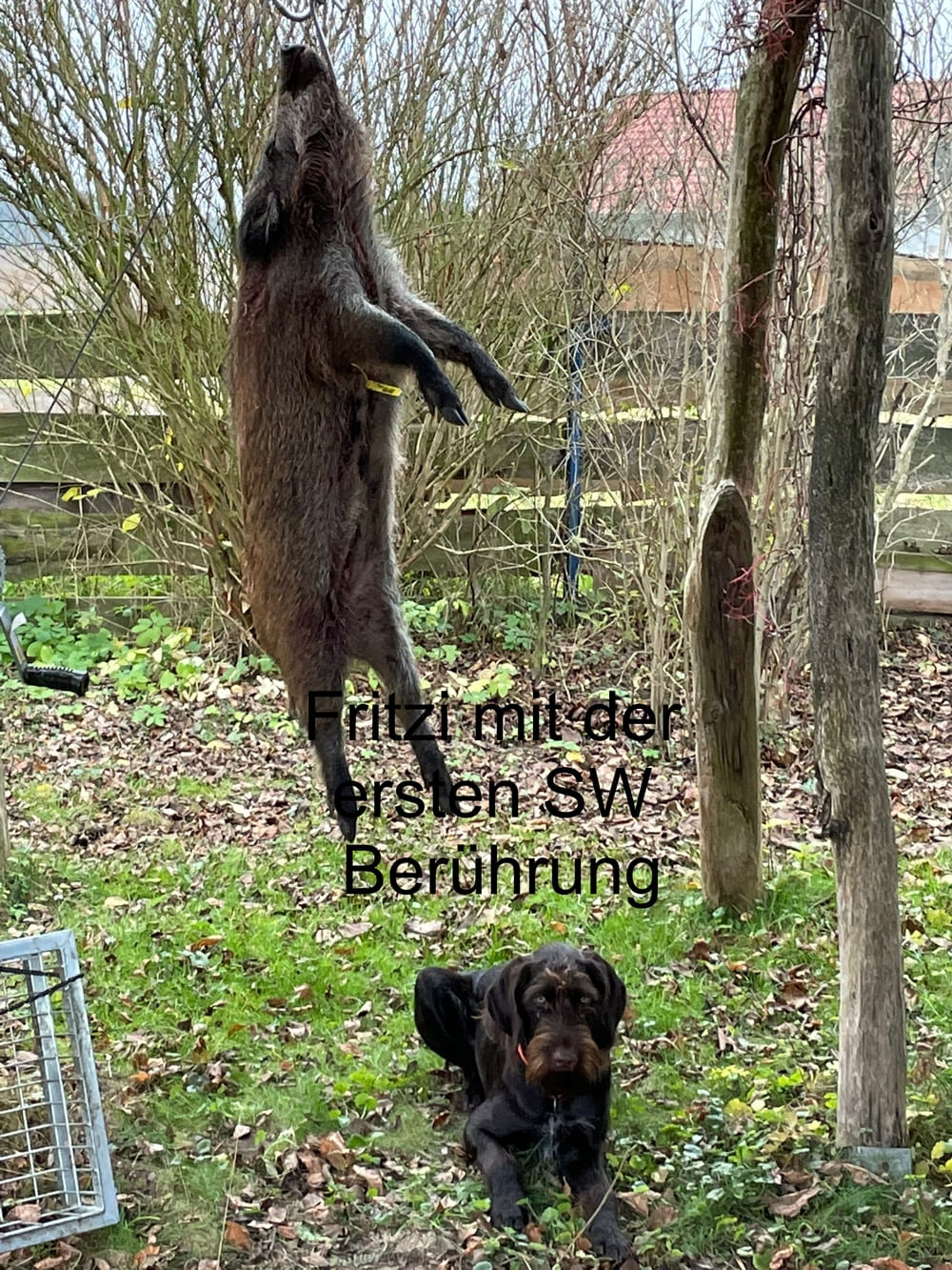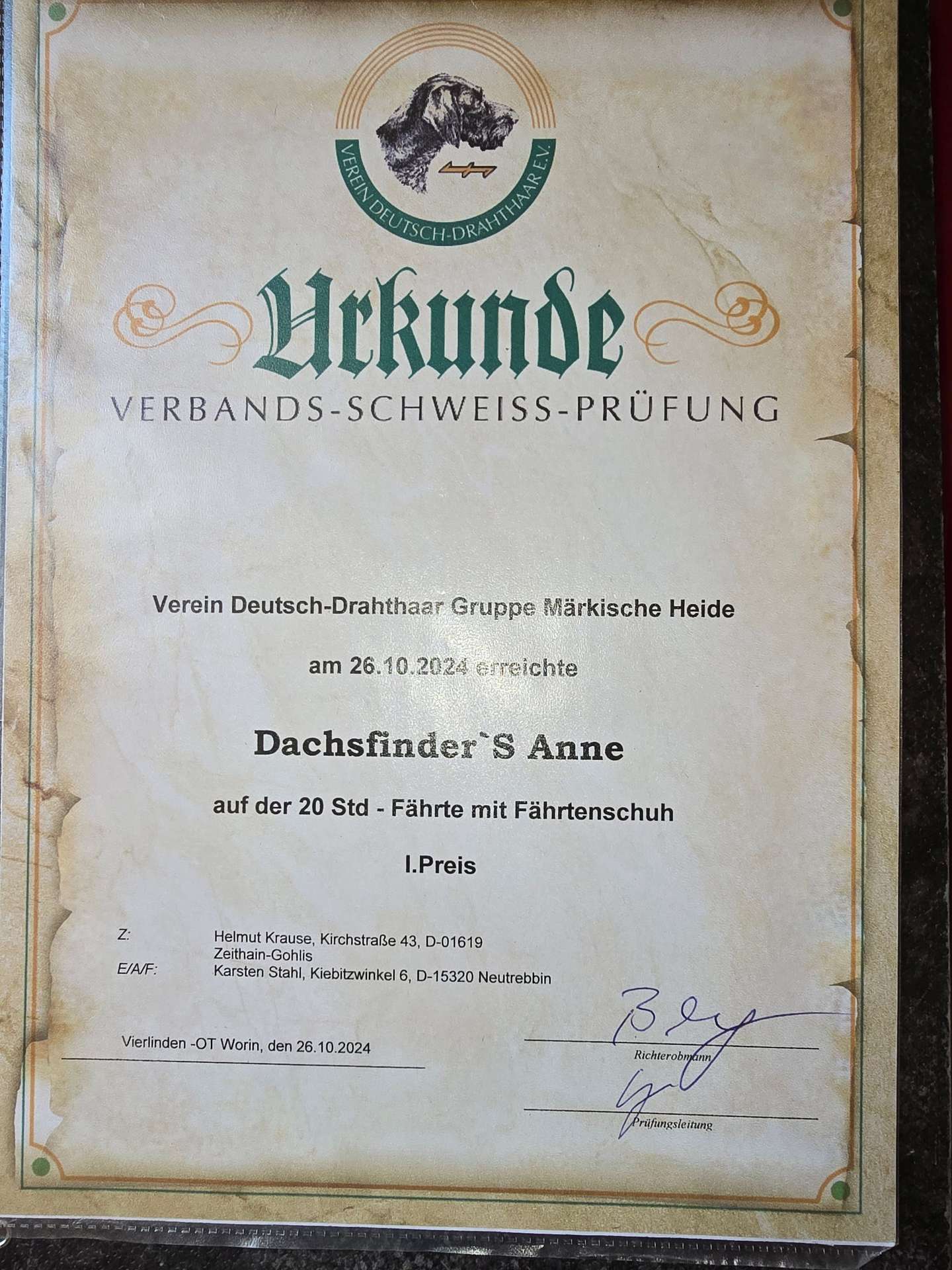 Seit den 01.01.2025 haben wir auch einen Deutschen Jagdterrier Zwinger " vom Kietzer See". Anni war auch fleißig, im Oktober 2024 absolvierte Anni die Verbandsfährtenschuhprüfung 20 Stunden mit bestandenen ersten Preis. Anni ist ein Vollgebrauchshund sie kann eigentlich alles auch Vorstehen sie zeigt den Fasan an. Hat sie von unseren DD mit den ist sie jeden Tag im Revier und da wir viele Fasane haben arbeitet sie auch jeden Tag daran. Bemerkenswert ist ihr Orientierungssinn; da wo sie Startet kommt sie auch wieder. Kommt selten vor beim Terrier Sie hat es. Mit dem ersten Wurf unserer DD Hündin Franzi vom Kiebitzwinkel war Anni wie eine NANNI. Einfach beeindruckend.