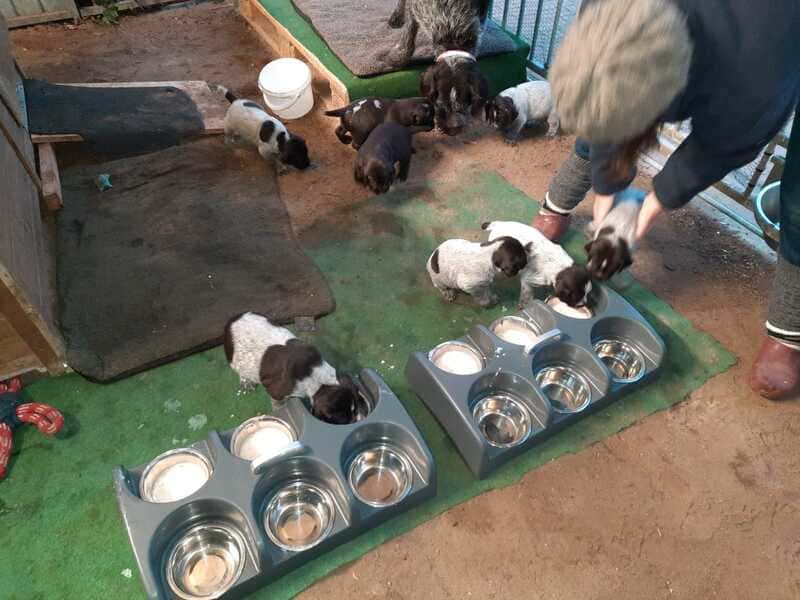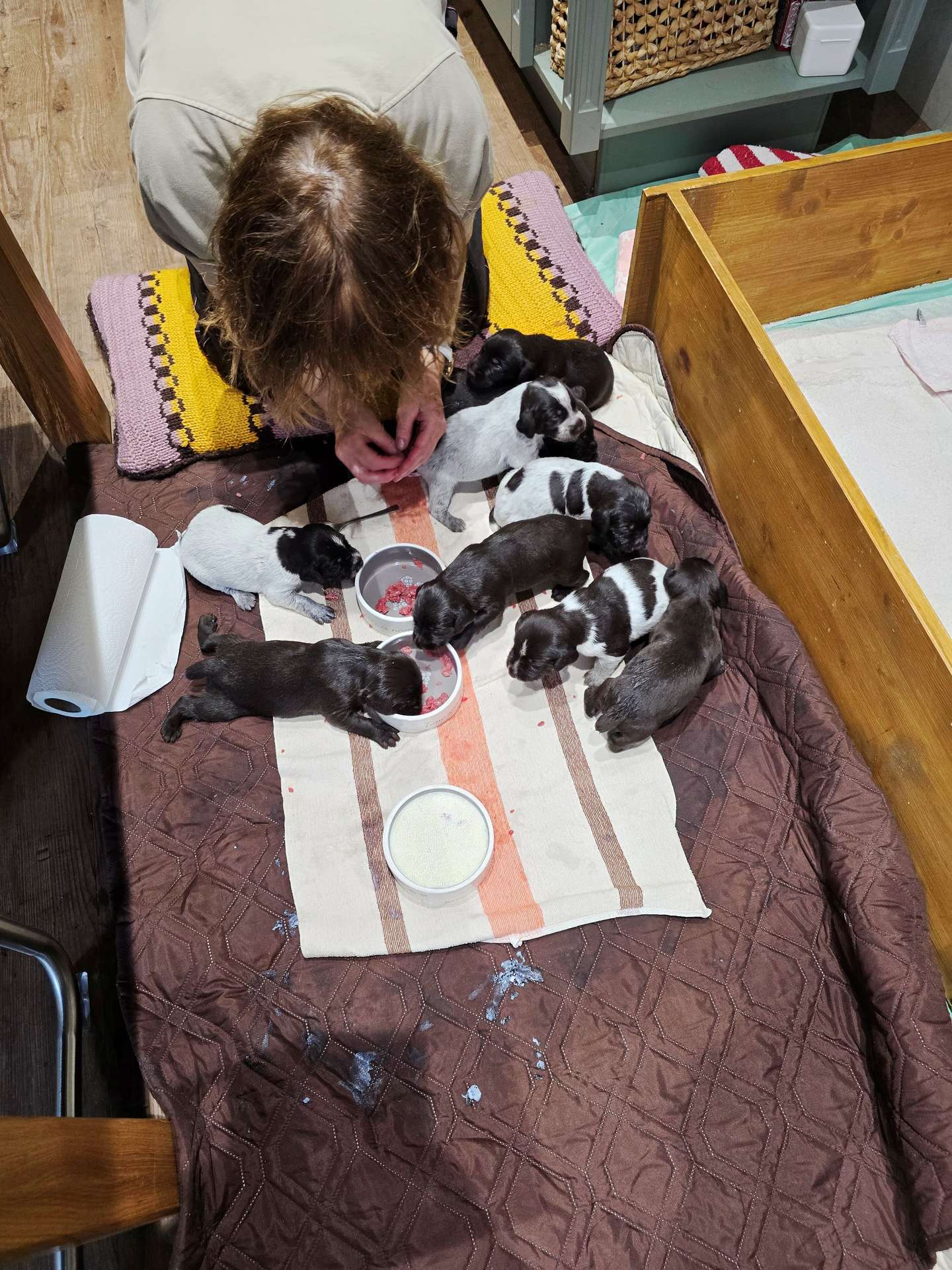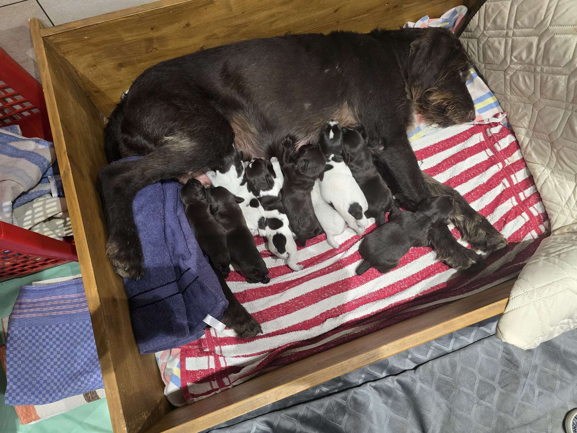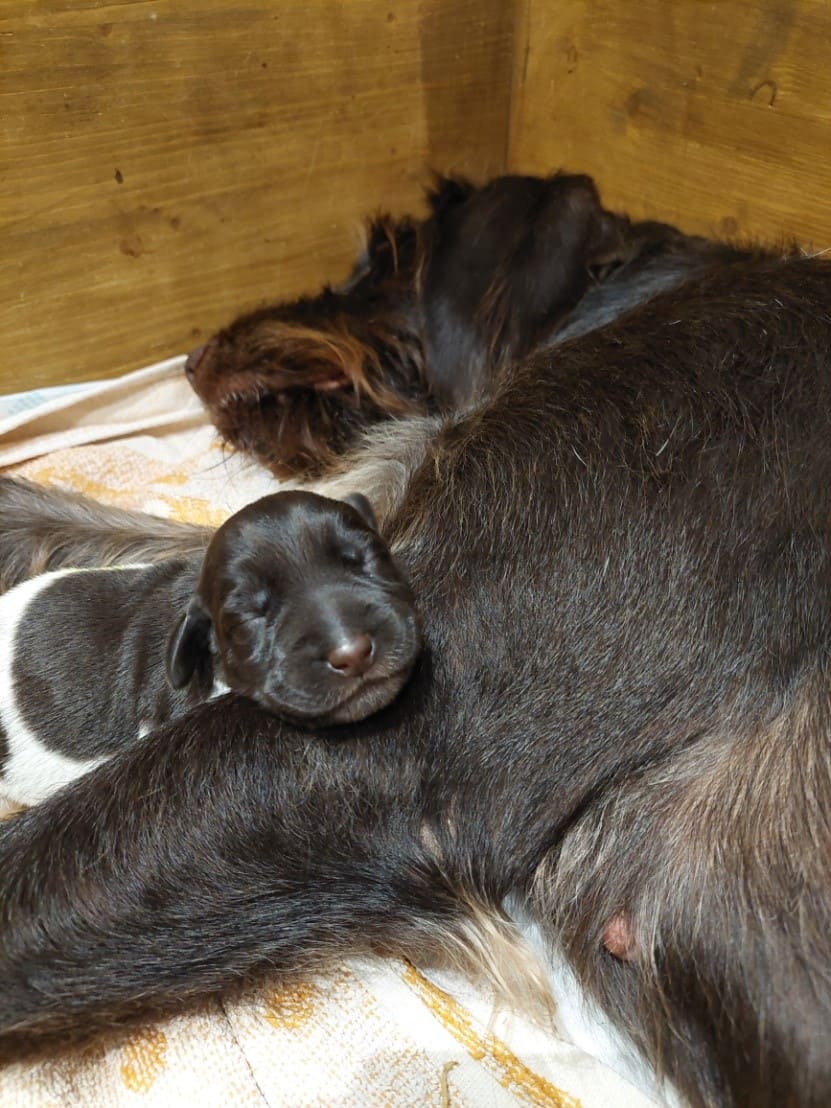 Der Zweite Wurf von Franz vom Kiebitzwinkel liegt. 3 Rüden und 6 Hündinnen darunter 4 Brsch davon 1 Rüde und 3 Hündinnen und 5 Braune mit Brustfleck darunter 2 Rüden und 3 Hündinnen. Alle wohl auf.